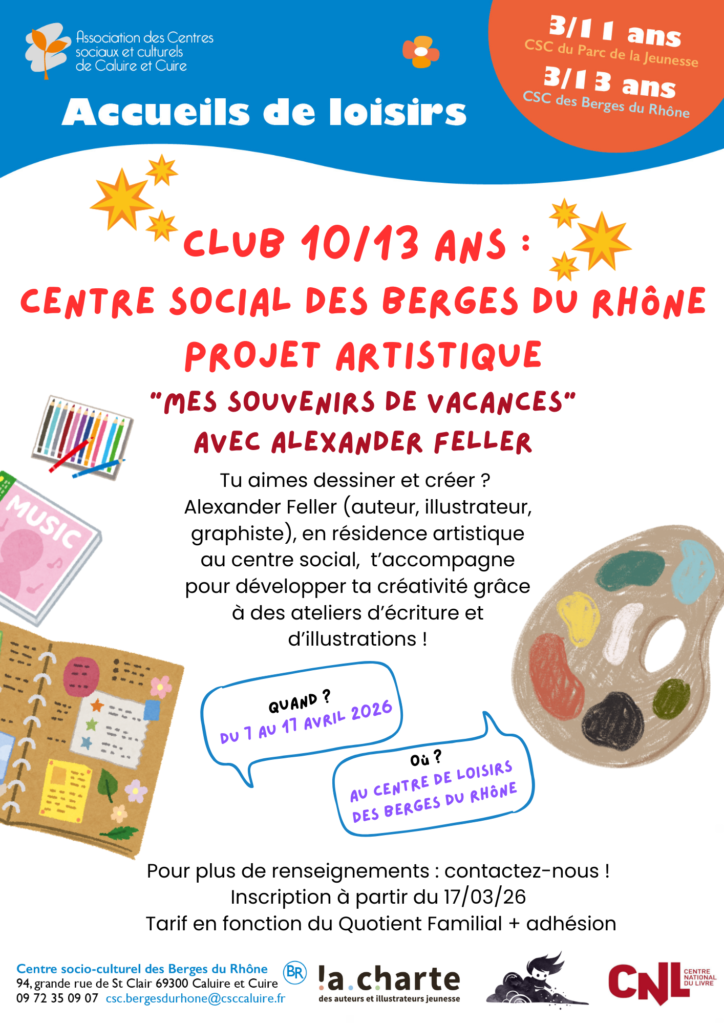 Vient révéler ta créativité en participant à un projet de création artistique avec Alexander Feller (graphiste, auteur, illustrateur), en résidence artistique au Centre socio-culturel des Berges du Rhône et en partenariat avec le Centre National du Livre (CNL) !   📖  ✏️
